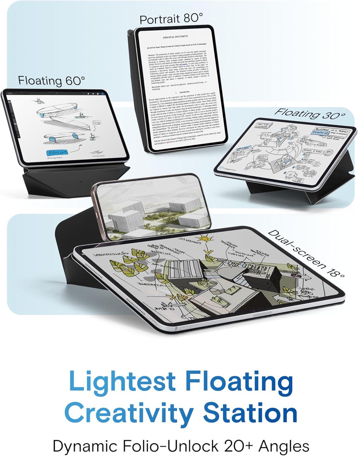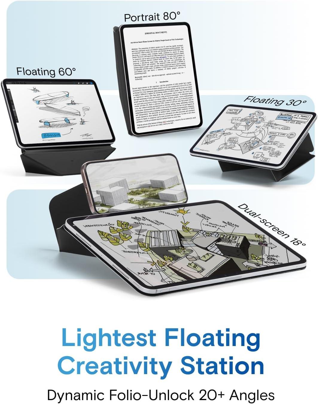 Ultimate Ergonomic Floating Modes – MOFT Dynamic Folio Case makes iPad ergonomics effortless for mobile creativity – featuring a single-piece structure that effortlessly folds into a workstation lifting iPads up 2-inches. Frictionless angle shifts between 30° and 60° keep you aligned in your input-output framework.