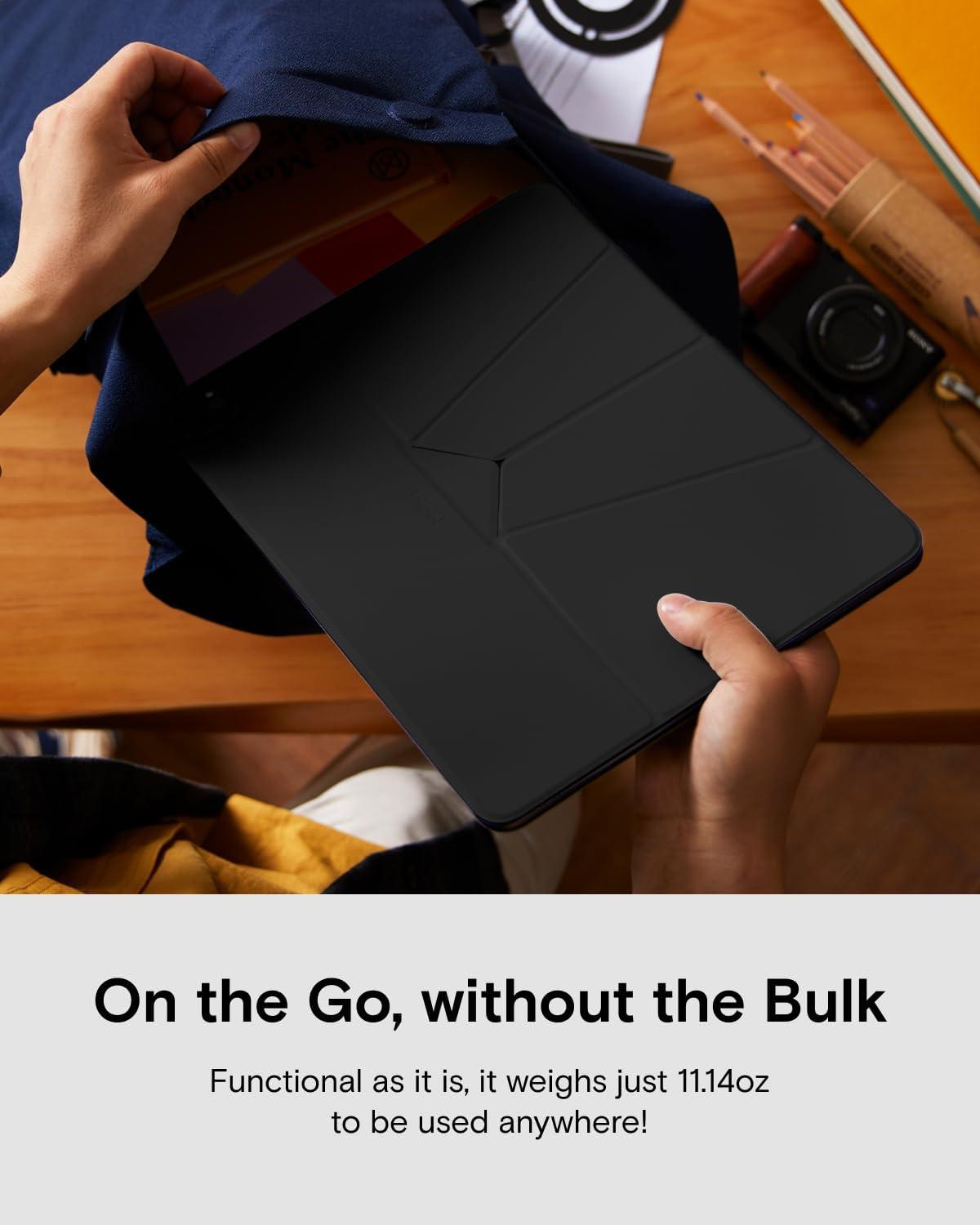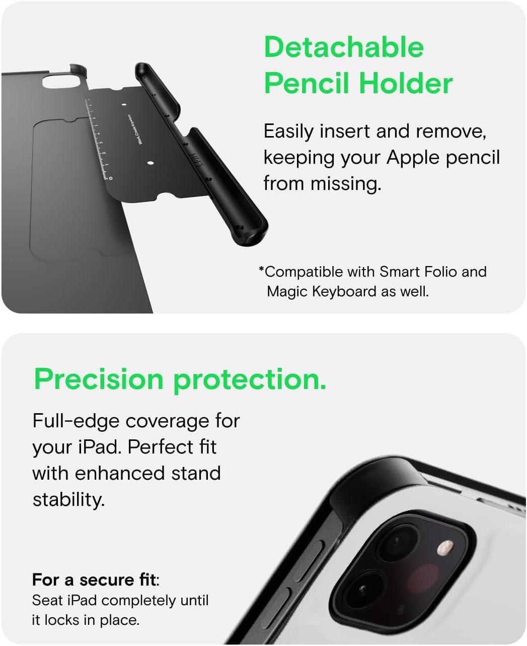 Detachable Pencil Protection – The innovative modular pen holder uses thin metal to secure your Apple Pencil. When you're ready to go, magnetically clip on the pencil holder to keep your Apple Pencil in place. Detach it anytime for a comfortable iPad grip.