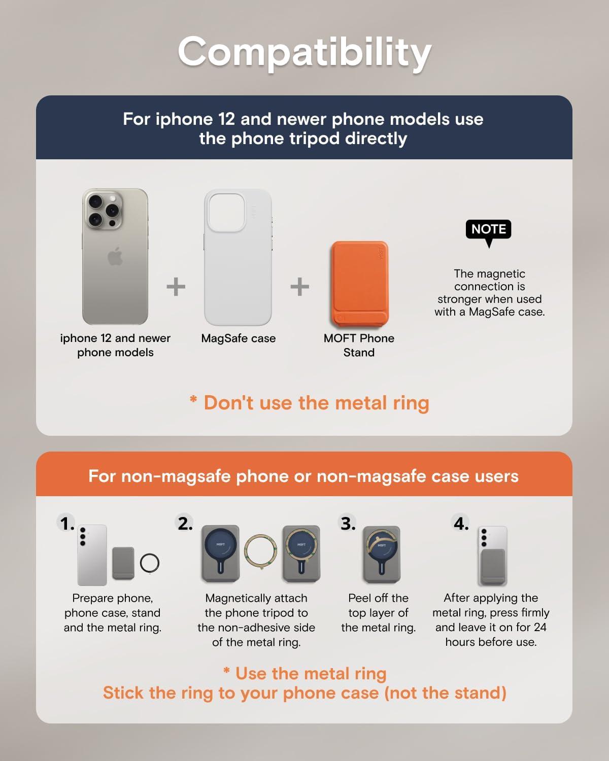 Universal Compatibility: MOFT Phone Tripod fits iPhone 17/16/15/14/13/12 series and MagSafe cases. For other devices (such as Samsung) and non-magnetic cases, the phone stand can be attached using the included metal ring. Please check the product dimensions (3.8in X 2.5in X 0.27in) to ensure it fits the back of your phone without obstructing the camera. The slim design ensures your phone’s lenses stay unobstructed-perfect for Instagram-worthy shots at cafes, parks, or business events.