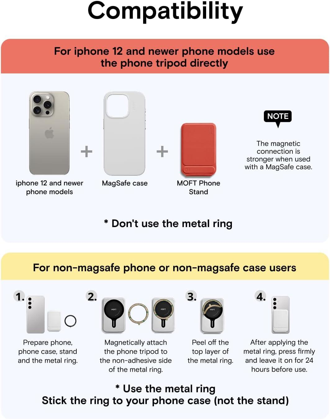 Universal Compatibility: MOFT Phone Tripod fits iPhone 17/16/15/14/13/12 series and MagSafe cases. For other devices (such as Samsung) and non-magnetic cases, the phone stand can be attached using the included metal ring. Please check the product dimensions (3.8in X 2.5in X 0.27in) to ensure it fits the back of your phone without obstructing the camera. The slim design ensures your phone’s lenses stay unobstructed-perfect for Instagram-worthy shots at cafes, parks, or business events.