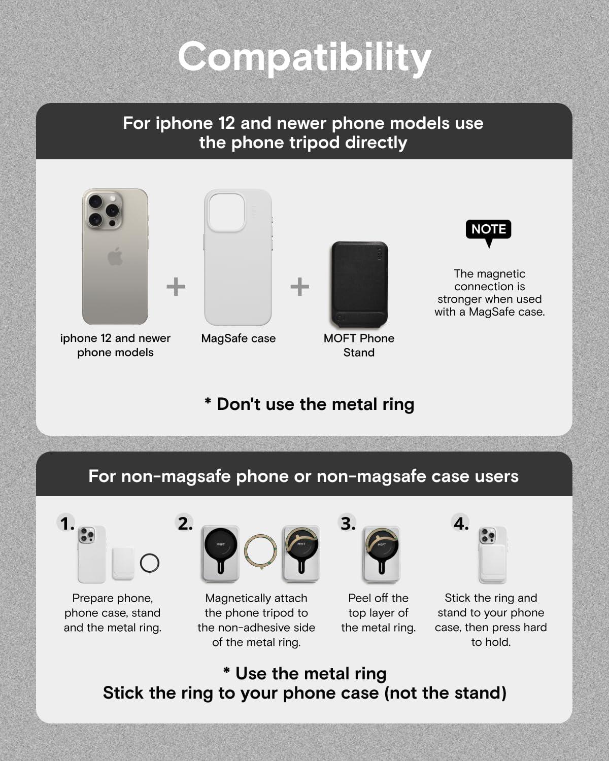 Universal Compatibility: MOFT Phone Tripod fits iPhone 17/16/15/14/13/12 series and MagSafe cases. For other devices (such as Samsung) and non-magnetic cases, the phone stand can be attached using the included metal ring. Please check the product dimensions (3.8in X 2.5in X 0.27in) to ensure it fits the back of your phone without obstructing the camera. The slim design ensures your phone’s lenses stay unobstructed-perfect for Instagram-worthy shots at cafes, parks, or business events.