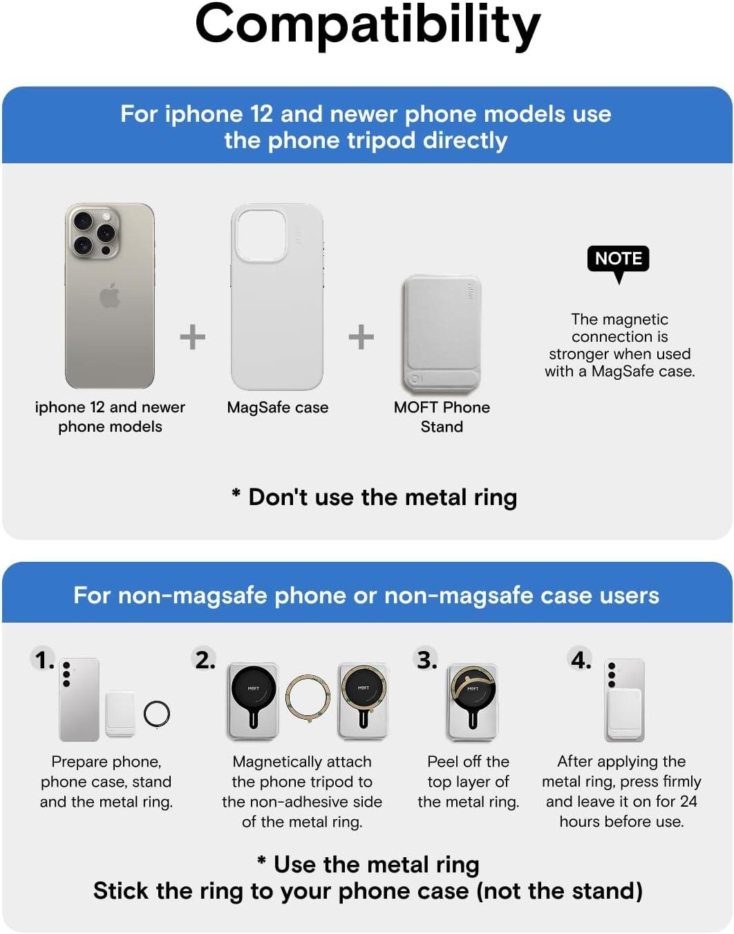 Universal Compatibility: MOFT Phone Wallet is compatible with iPhone 16/15/14/13/12 series and MagSafe cases. For other devices (such as Samsung) and non-magnetic cases, the phone stand can be attached using the included magnetic ring. Please check the product dimensions (3.8in X 2.5in X 0.35in) to ensure it fits the back of your phone without obstructing the camera. The slim design ensures your phone’s lenses stay unobstructed—perfect for Instagram-worthy shots at cafes or business events.