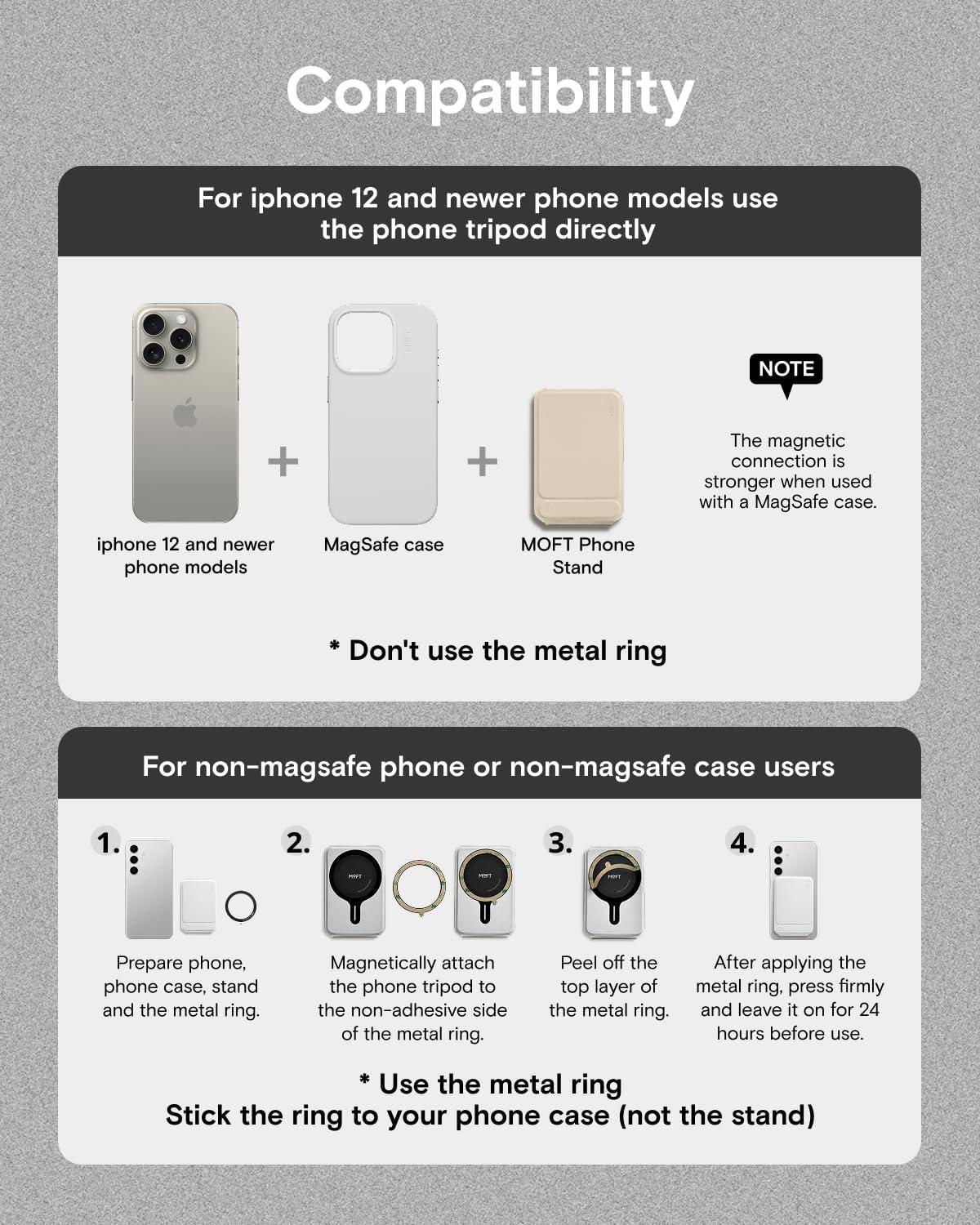Universal Compatibility: MOFT Phone Wallet is compatible with iPhone 16/15/14/13/12 series and MagSafe cases. For other devices (such as Samsung) and non-magnetic cases, the phone stand can be attached using the included magnetic ring. Please check the product dimensions (3.8in X 2.5in X 0.35in) to ensure it fits the back of your phone without obstructing the camera. The slim design ensures your phone’s lenses stay unobstructed—perfect for Instagram-worthy shots at cafes or business events.