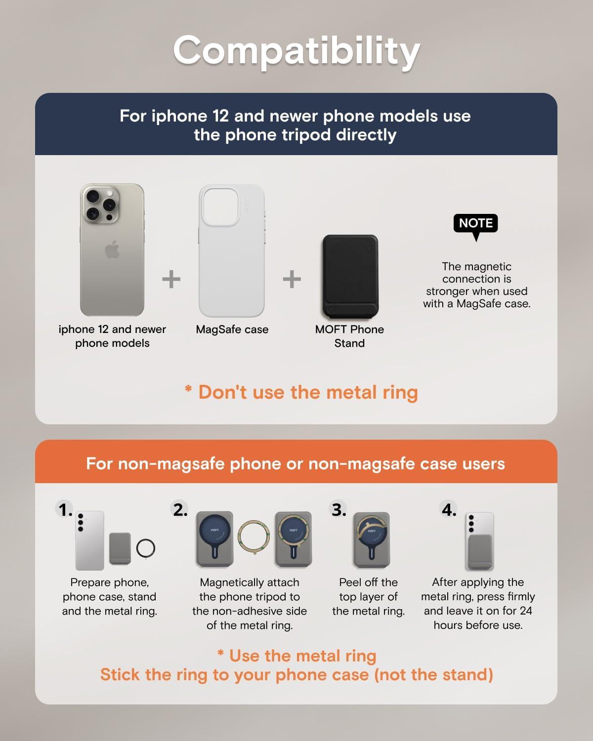 Universal Compatibility: MOFT Phone Wallet is compatible with iPhone 16/15/14/13/12 series and MagSafe cases. For other devices (such as Samsung) and non-magnetic cases, the phone stand can be attached using the included magnetic ring. Please check the product dimensions (3.8in X 2.5in X 0.35in) to ensure it fits the back of your phone without obstructing the camera. The slim design ensures your phone’s lenses stay unobstructed—perfect for Instagram-worthy shots at cafes or business events.