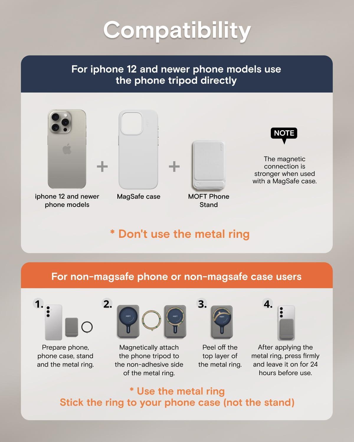 Universal Compatibility: MOFT Phone Wallet is compatible with iPhone 16/15/14/13/12 series and MagSafe cases. For other devices (such as Samsung) and non-magnetic cases, the phone stand can be attached using the included magnetic ring. Please check the product dimensions (3.8in X 2.5in X 0.35in) to ensure it fits the back of your phone without obstructing the camera. The slim design ensures your phone’s lenses stay unobstructed—perfect for Instagram-worthy shots at cafes or business events.