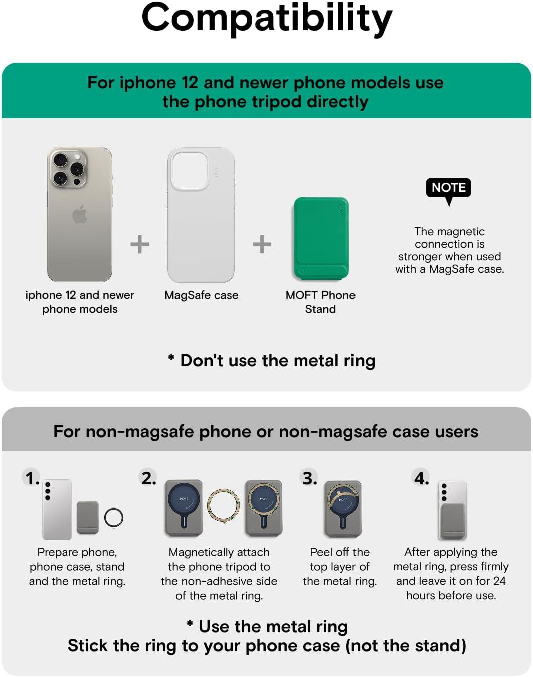 Universal Compatibility: MOFT Phone Wallet is compatible with iPhone 16/15/14/13/12 series and MagSafe cases. For other devices (such as Samsung) and non-magnetic cases, the phone stand can be attached using the included magnetic ring. Please check the product dimensions (3.8in X 2.5in X 0.35in) to ensure it fits the back of your phone without obstructing the camera. The slim design ensures your phone’s lenses stay unobstructed—perfect for Instagram-worthy shots at cafes or business events.