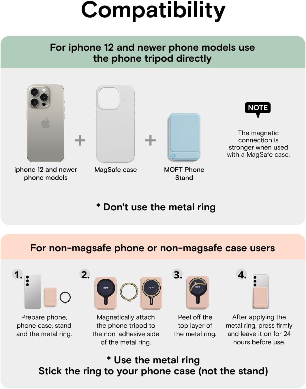 Universal Compatibility: MOFT Phone Wallet is compatible with iPhone 16/15/14/13/12 series and MagSafe cases. For other devices (such as Samsung) and non-magnetic cases, the phone stand can be attached using the included magnetic ring. Please check the product dimensions (3.8in X 2.5in X 0.35in) to ensure it fits the back of your phone without obstructing the camera. The slim design ensures your phone’s lenses stay unobstructed—perfect for Instagram-worthy shots at cafes or business events.