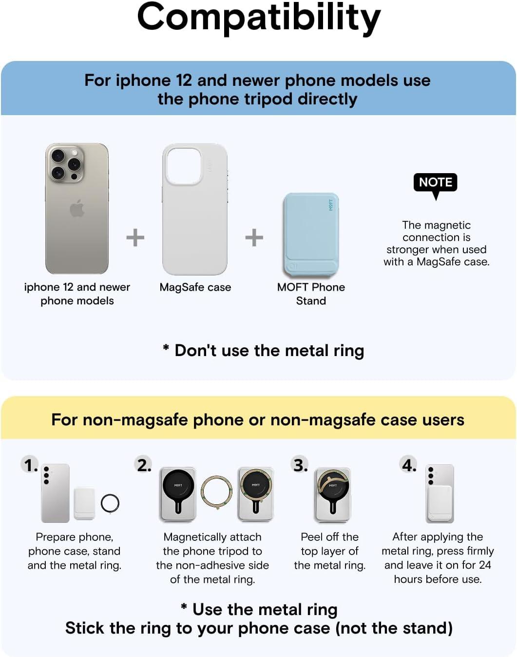 Universal Compatibility: MOFT Phone Wallet is compatible with iPhone 16/15/14/13/12 series and MagSafe cases. For other devices (such as Samsung) and non-magnetic cases, the phone stand can be attached using the included magnetic ring. Please check the product dimensions (3.8in X 2.5in X 0.35in) to ensure it fits the back of your phone without obstructing the camera. The slim design ensures your phone’s lenses stay unobstructed—perfect for Instagram-worthy shots at cafes or business events.